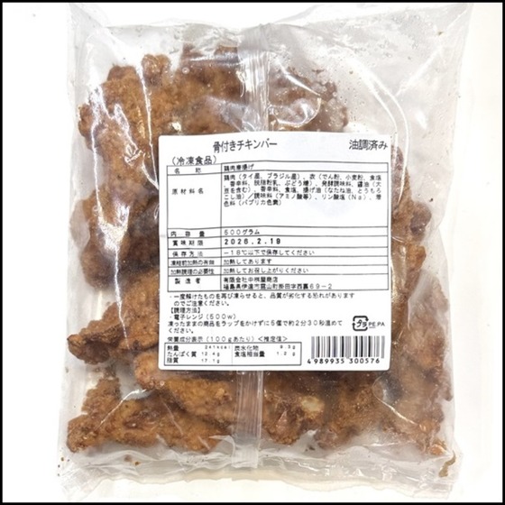 原材料・添加物 | 鶏肉(タイ産、ブラジル産)、衣(でん粉、小麦粉、食塩、香辛料、脱脂粉乳、ぶどう糖)、発酵調味料、醤油(大豆を含む)、香辛料、食塩、揚げ油(なたね油、とうもろこし油)/調味料(アミノ酸等)、リン酸塩(Na)、着色料(パプリカ色素 |