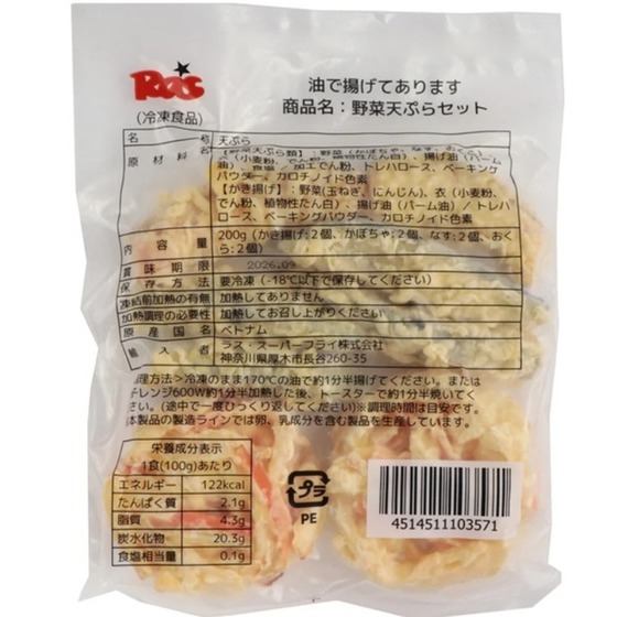 原材料・添加物 | 【野菜天ぷら類】:野菜(かぼちゃ、なす、おくら)、衣(小麦粉、でん粉、植物性たん白)、揚げ油(パーム油)、食塩/加工でん粉、トレハース、ベーキングパウダー、カロチノイド色素 【かき揚げ】:野菜(たまねぎ、にんじん)衣(小麦粉、でん粉、植物性たん白)、揚げ油(パーム油) /トレハース、ベーキングパウダー、カロチノイド色素 |