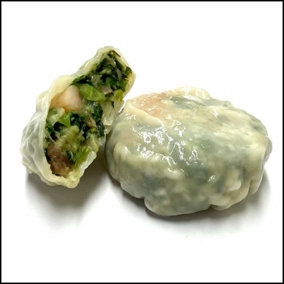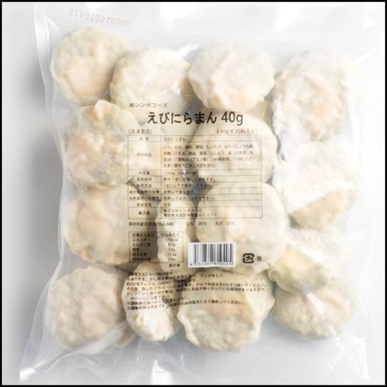 | 原材料・添加物 | 具(にら、えび、豚肉、豚脂、しいたけ、長ねぎ、ばれいしょでん粉、砂 糖、ごま油、醤油、しょうが、清酒、食塩、こしょう)、皮(小麦粉、大 豆油)/ 調味料(アミノ酸)、リン酸Na、(一部にえび・小麦・豚肉・ご ま・大豆を含む) |