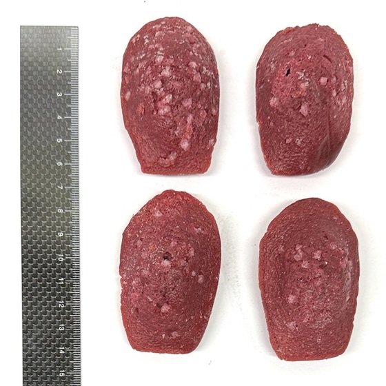 鮮やかな赤い生地にパールシュガーをトッピングした華やかさと高級感を演出できるラズベリー風味のマドレーヌです。