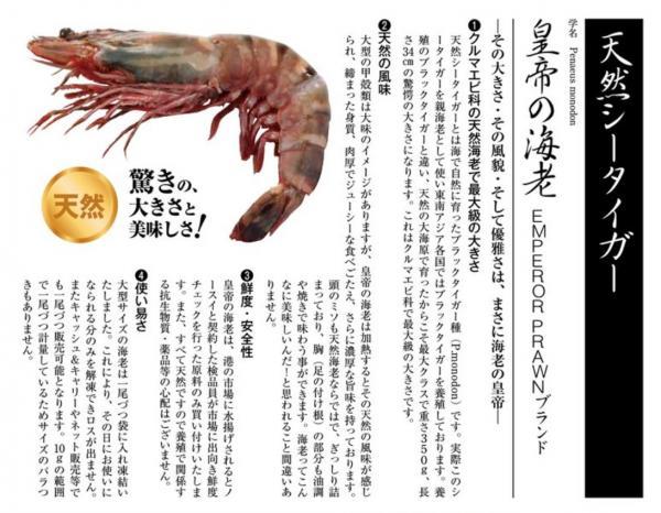 ■海で自然に育ったキングサイズの天然ブラックタイガー種です。 規 格:ST5 重 さ:約230~290g 身 長:約30~32cm 胴回り:約14~15cm その大きさ、風貌、そして優雅さはまさに海老の皇帝といえるでしょう。 包装パックは1尾ずつ使えるよう、1尾ずつ凍結パッキングしました。 純白で肉厚な断面は圧倒されるようなインパクトがあり、天然海老ならではの濃厚でクリーミーなミソも丸ごと味わえ、海老の風味や濃厚な旨味、ジューシーな食べごたえをお楽しみ頂けます。