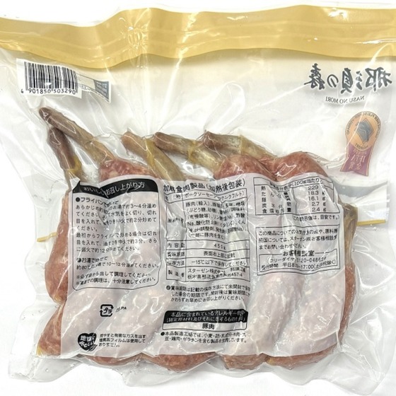 | 原材料・添加物 | 豚肉(輸入)、豚脂肪、食塩、糖類(ぶどう糖、砂糖)、香辛料、/調味料(有機酸等)、リン酸塩(Na)、酢酸Na、酸化防止剤(ビタミンC)、くん液、pH調整剤、発色剤(亜硝酸Na)、(一部に豚肉を含む) |