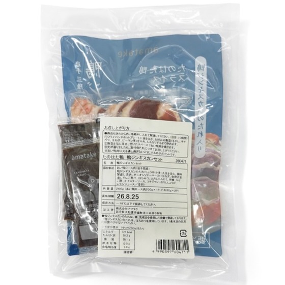 | 原材料・添加物 | あい鴨ロース肉(岩手県産) 鴨ジンギスカンのたれ<しょうゆ(小麦・大豆を含む、国内製造)、清酒、オニオンソテーペースト(玉ねぎ、食用大豆油)、りんご果汁、はちみつ、おろしにんにく、砂糖、りんご酢、オイスターソース、コチジャン、おろししょうが、レモンジュース/香料> |