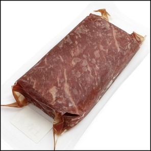 カナダ産・ポーランド、メキシコ、アルゼンチン、フランス、ウルグアイ、アイスランド産の穀物肥育された大型馬から、特上専用の部位(バラ肉)だけを国内工場でサク取りして真空パック。